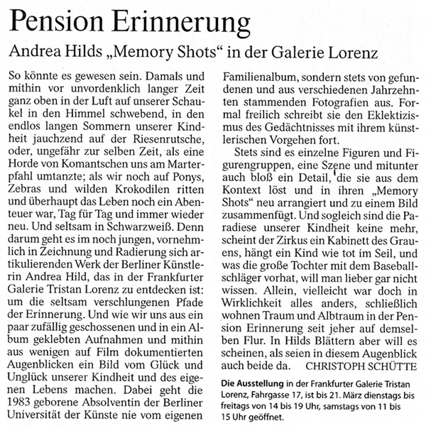 (...) Auch die Zeichnungen und Materialcollagen von Andrea Hild, Meisterschülerin an der UdK Berlin, sind durch eine solche prozesshafte Offenheit charakterisiert. Wenngleich ihre Bildwelten sich im Gegensatz zu Angelika Arendt und Ute Litzkow weniger natürliche Szenarien widmen, als sich vielmehr einem noch näher zu betrachtenden sozialen Kontext des menschlichen Lebens zuwenden, macht bereits die Analyse der eingesetzten Bildmittel deutlich, dass auch in den Arbeiten von Andrea Hild verschiedene Ebenen synthetisiert werden, das etwas scheinbar Disparates zusammengeführt wird und neue inhaltlich wie formale Kontexte eröffnet.